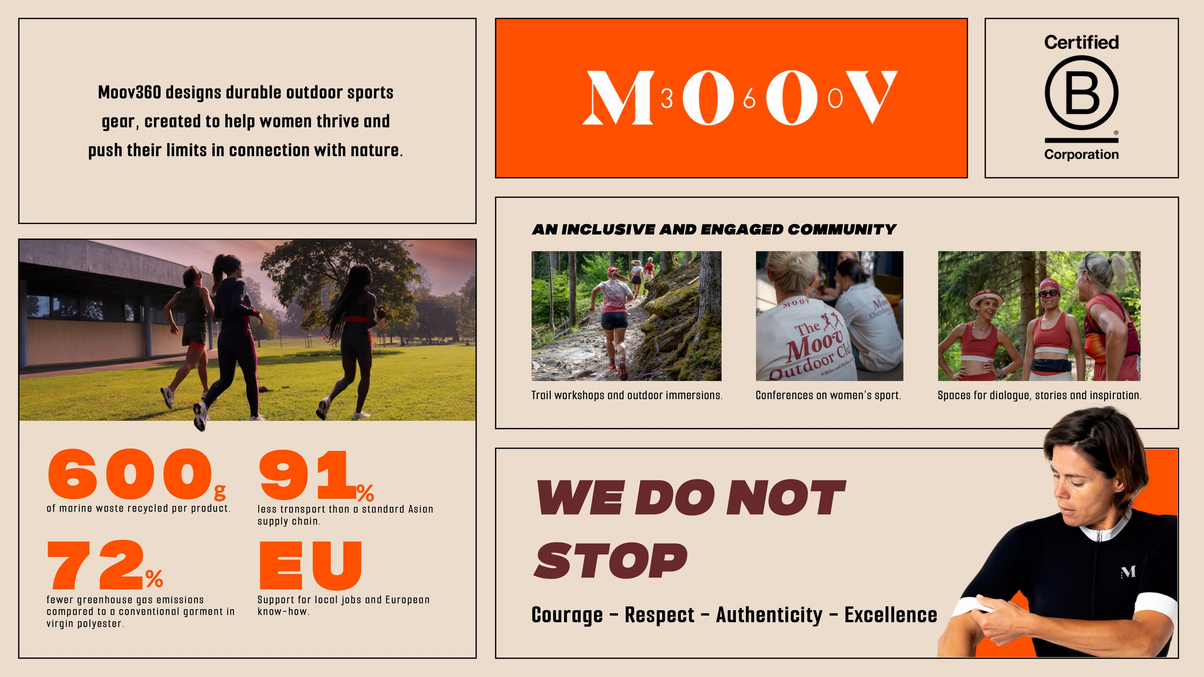 CIRCULARITY To further our eco-responsible approach, we want to give our clothing a second life. When you no longer wear your Moov360 pieces, we'll take them back for a 10% discount on your next purchase. We then transform them into sports accessories. (Return at our expense) Nothing is lost, everything is recovered. Our key words are sustainability, circularity, zero waste, ethics, transparency, and inclusion.