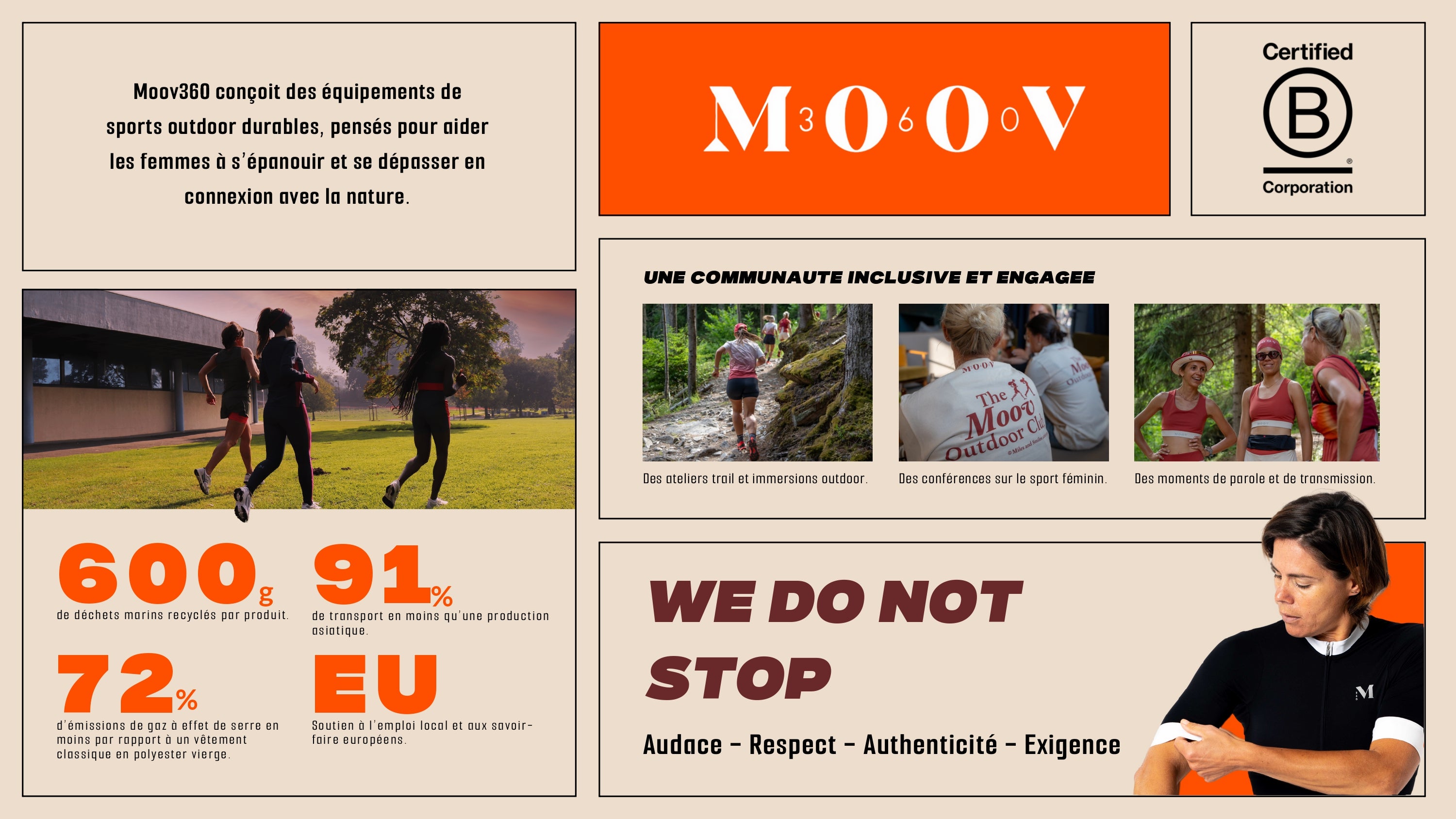 CIRCULARITÉ Afin d’aller jusqu’au bout de notre démarche éco-responsable, nous souhaitons offrir une seconde vie à nos vêtements. Lorsque vous ne portez plus vos pièces Moov360, nous les reprenons contre 10% de remise sur votre prochain achat. Nous les transformons ensuite en accessoires de sport. (renvoi à nos frais) Rien ne se perd, tout se récupère. Nos maîtres mots sont durabilité, circularité, zéro déchet, éthique, transparence et inclusion.